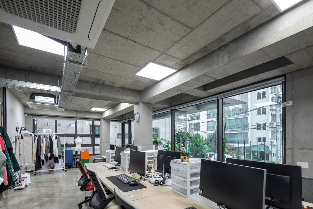 의류 업체의 특성을 반영한 사옥을 계획한다. 의상 컨셉에 맞춰 변화하는 건축물이 되었으면 한다. 내부의 옷과 광고 등 기업의 이미지가 돋보일 수 있도록 색감의 사용을 제한하고, 자재의 질감 차이를 이용한 외관디자인을 한다.