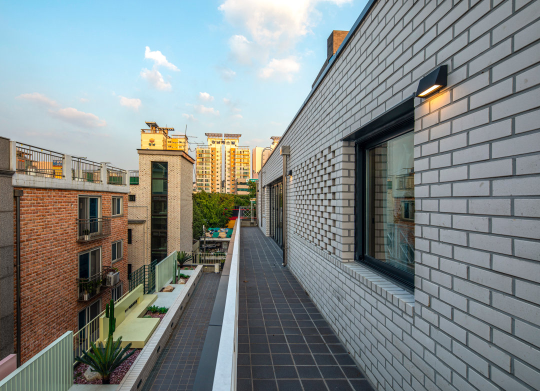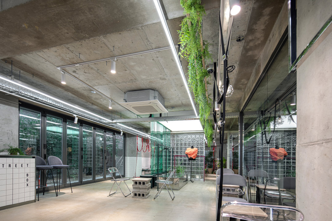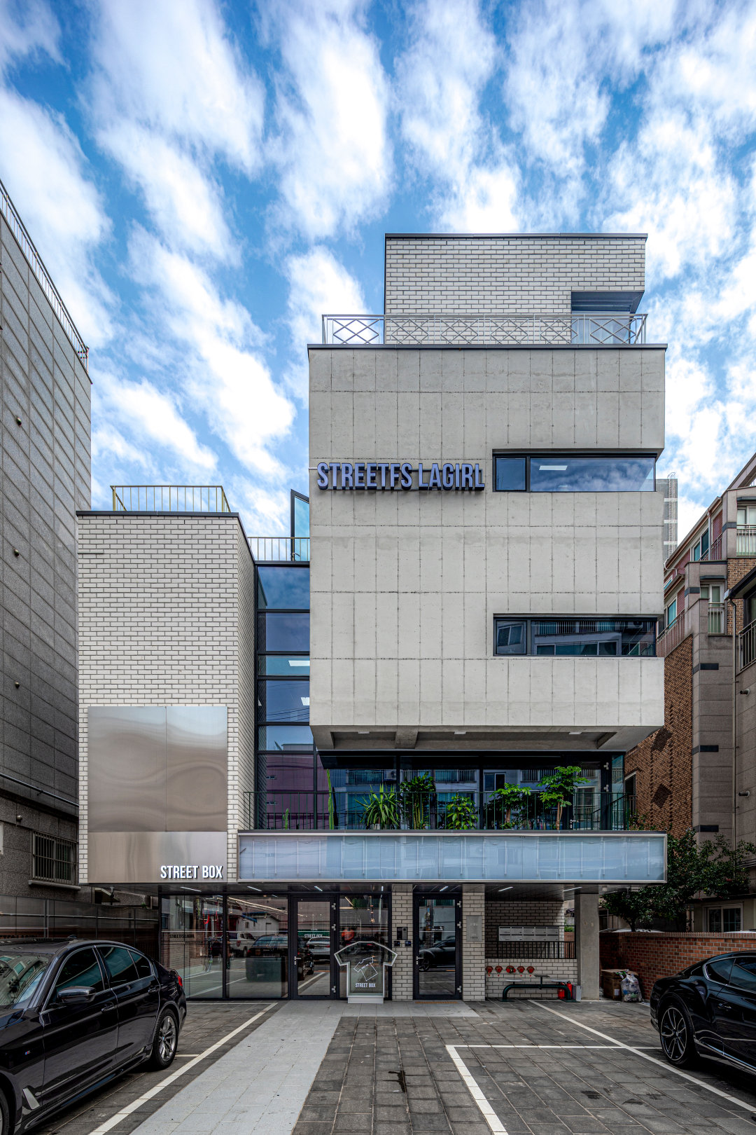 도로와 건축공간의 영역성이 구분되어 ‘건물과 도로’로 인식되는 것을 피하고자 1층의 카페 및 프로모션 공간을 계획한다. 카페 겸 쇼룸 STREET BOX는 옷과 음료를 함께 즐길 수 있는 공간으로 만들었다.